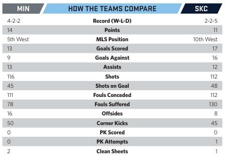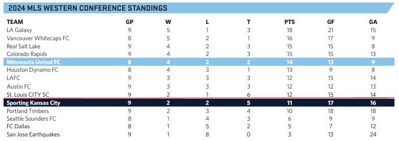 The Western Conference table is tight. While MNUFC and SKC are separated by five places, the table can be deceptive. Three of the four teams between today's combatants are tied at 12 points. Only 8 points separate the LA Galaxy in 1st place and the Portland Timbers in 11th place.