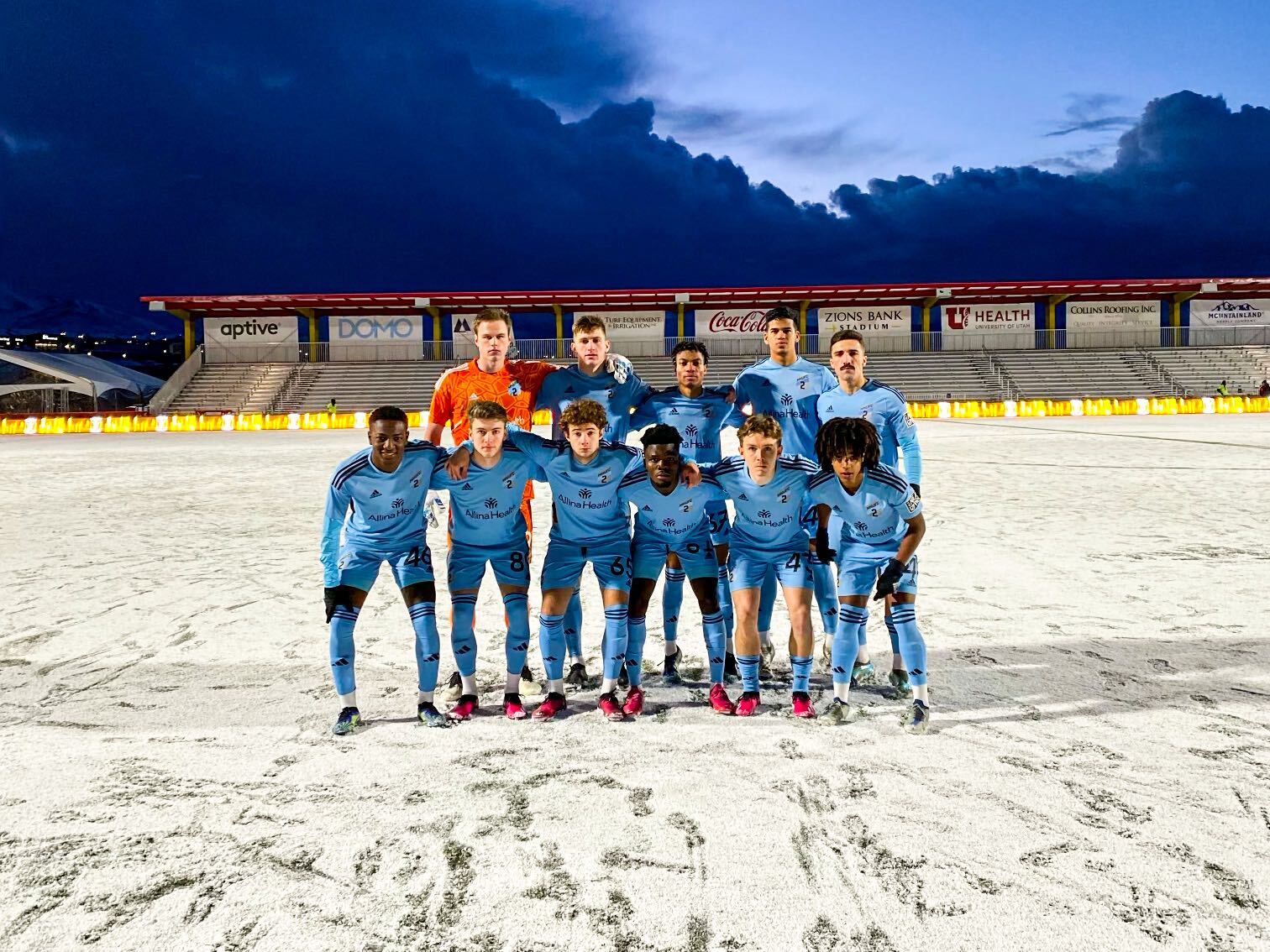 Minnesota scored the opening goal of the night on the snow covered pitch in the 39th minute when Keith Romanshyn sent a beautiful long pass from inside the centre circle through the middle to Diogo Pacheco. Pacheco took control of the pass near the top of the box and immediately squeezed a low shot between SLC keeper Blake Kelly and the nearside post to make the game 1-0. MNUFC2 would score once again before the halftime break when Loïc Mesanvi received a long pass and drew Blake Kelly towards him as he got to the top of the six yard box. Mesanvi then slipped a low short cross to Fatorma Conneh who finished the play with a shot from inside the six into a wide open goal.