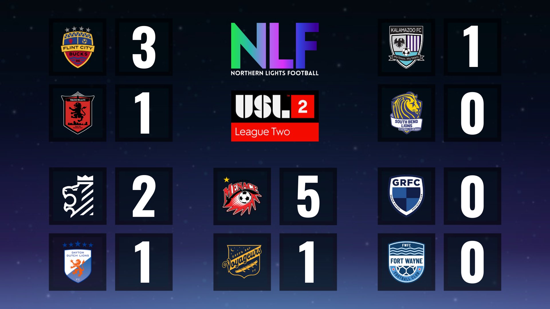 This weekend saw USL League Two have a total of five matches between both of the Divisions in the Midwest. The Heartland saw the Des Moines Menace host the Green Bay Voyageurs in the division's only match that weekend. While in the Great Lakes the Flint City Bucks hosted Toledo Villa, Kings Hammer hosted the Dayton Dutch Lions, Kalamazoo FC hosted the South Bend Lions and lastly Fort Wayne FC traveled to Michigan to face Grand Rapids FC.